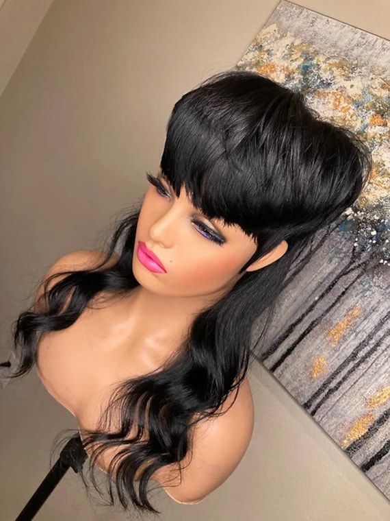 Full Machine Made Wig With Bangs Dovetail 18 Inches Body Wave Etsy